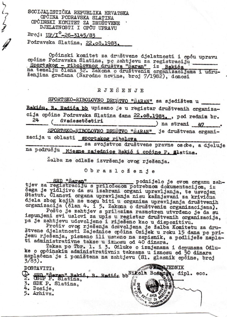 Od 2015. godine Športsko ribolovna udruga “Šaran” Bakić postaje ovlaštenik ribolovnog prava u ribolovnom području “Drava – Dunav” za ribolovne zone obuhvaćene administrativnim granicama grada Slatine i općina Mikleuš, Nova Bukovica, Sopje i Čađavica u Virovitičko-podravskoj županiji, koje je stekla dana 10. ožujka 2015. godine Rješenjem Ministarstva poljoprivrede (Kl.: UP/I 324-02/15-01/21, Ur. br.: 525-13/05-15-15-1) i Ugovorom o dodjeli ribolovnog prava (Kl.: 324-02/15-01/21, Ur. br.: 525-13/05-15-15-2).